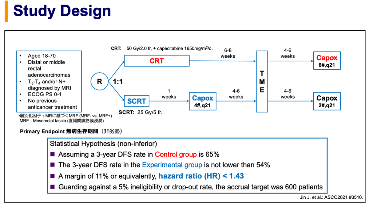 - STELLARはChemoradiotherapy(化学放射線療法:CRT)を標準治療群とし、とし、局所進行直腸癌(LARC)に対するShort-course RT (SCRT)→CAPOX (カペシタビン+オキサリプラチン) 4サイクルによるTotal neoadjuvant therapy (TNT)の有効性を評価した非劣性試験です(図1)。非劣性マージンはHR 1.43の設定でした。