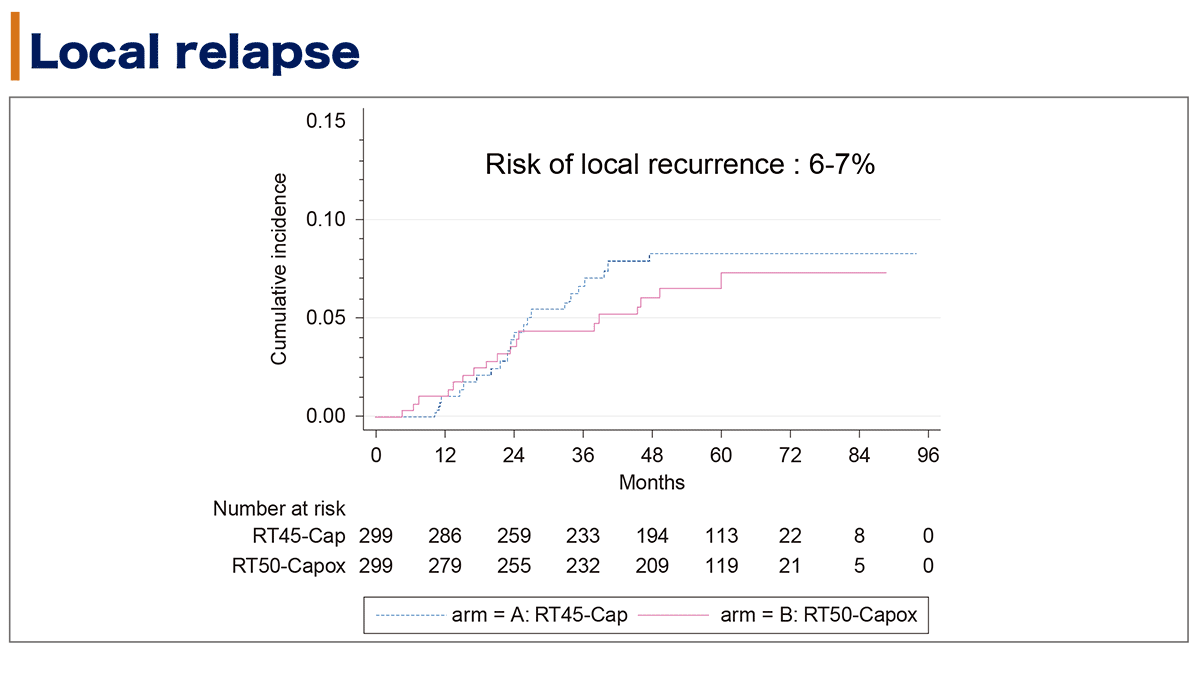 むしろ、遠隔転移は依然として25-30%に生じ、術後の遠隔転移をいかに抑えるかが重要なポイントである。また、直腸癌に対する術後補助化学療法はコンプライアンスが低く、術後の遠隔転移再発を抑えるためには、術前治療戦略に開発の余地がある。