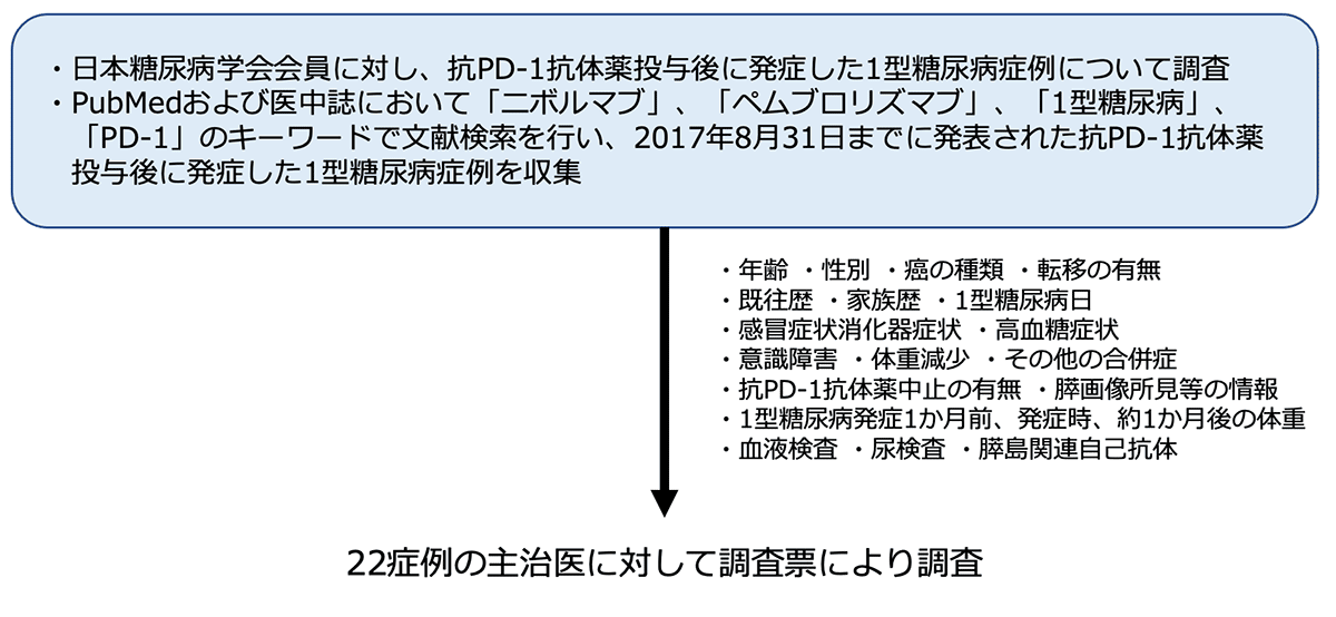 調査票による調査を行い、年齢、性別、癌の種類、転移の有無、既往歴、家族歴、1 型糖尿病発症日、感冒症状、消化器症状、高血糖症状、意識障害、体重減少、その他の合併症、抗PD-1 抗体中止の有無、膵画像所見等、1型糖尿病発症約1 ヶ月前、発症時、約1 ヶ月後の体重、血液検査、尿検査、膵島関連自己抗体について調査を実施した。