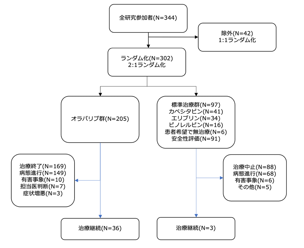 2014年4月-2015年11月までに、302例がランダム化され、205例がオラパリブ群、97例が標準治療群へ割り付けられた。データカットオフは、2016年12月9日(オラパリブ群のイベント数77.5%時点)とし、観察期間中央値は、オラパリブ群14.5ヶ月、標準療法群14.1ヶ月であった。