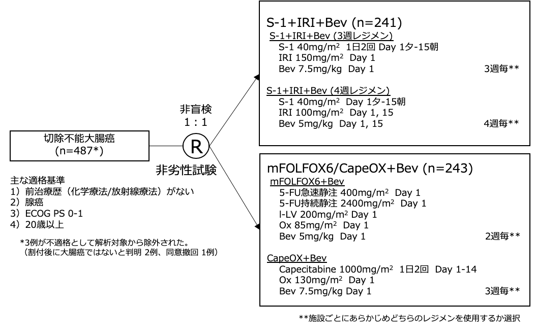- 2012年6月〜2014年9月の間に487例が国内53施設から登録され、除外された3例を除く484例(S-1+IRI+Bev群241例、 mFOLFOX6/CapeOX+Bev群243例)が解析対象となった。
