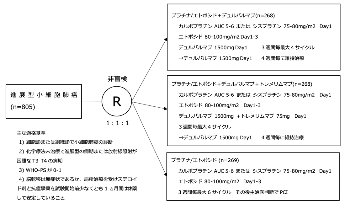 - 2017年3月27日〜2018年3月29日の期間に23か国209施設より972例が登録され、そのうち167例が除外され、Durva併用群には268例、Durva+トレメリムマブ併用群には268例、化学療法群には269例が無作為に割り付けられた。